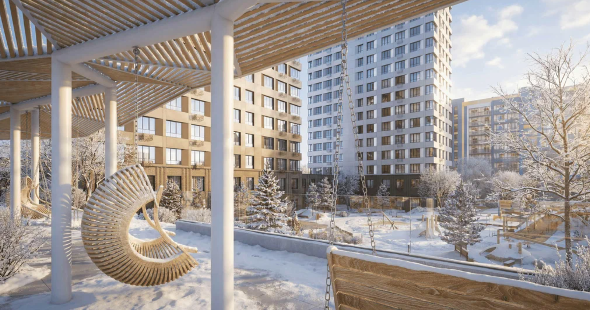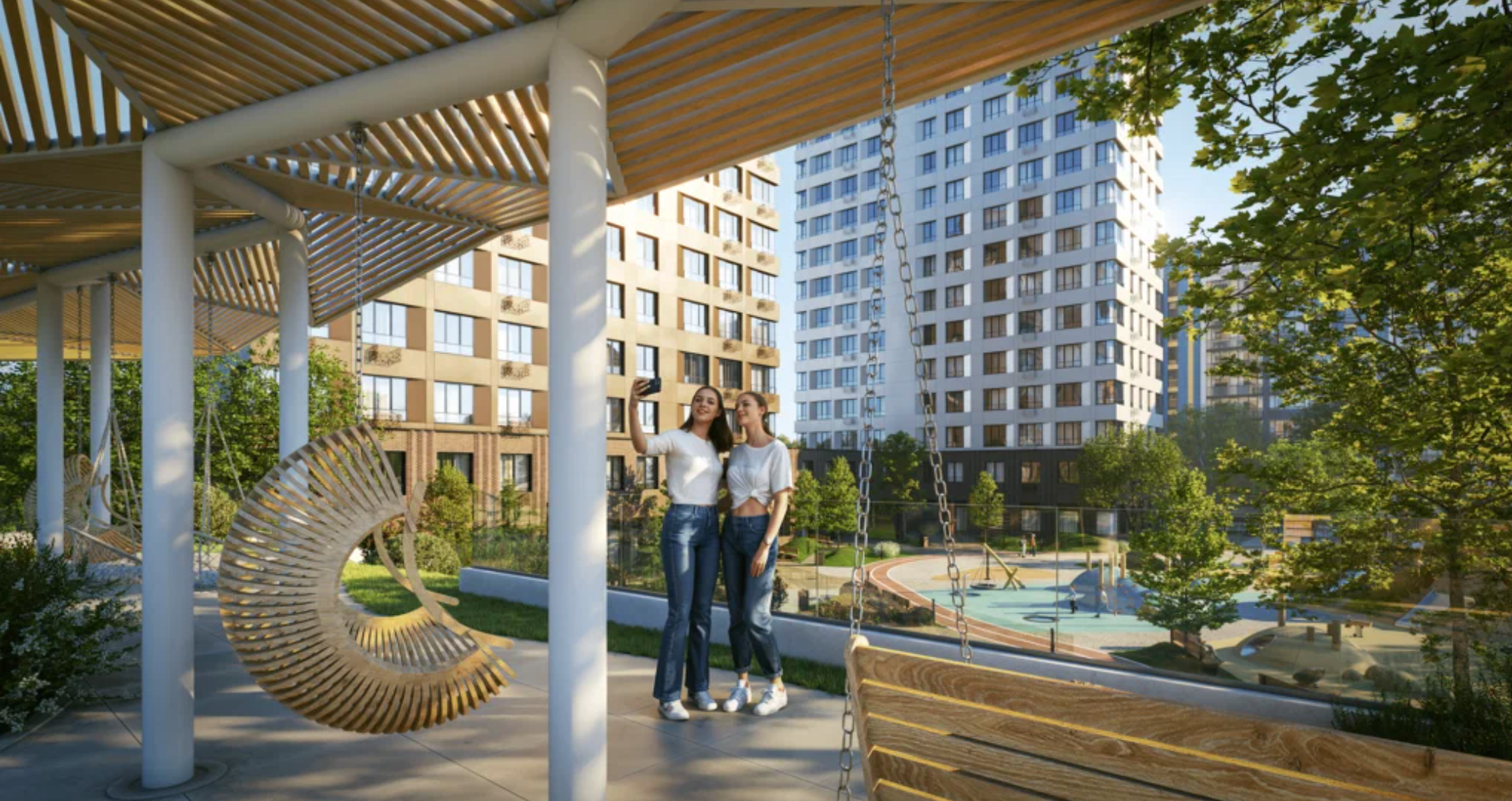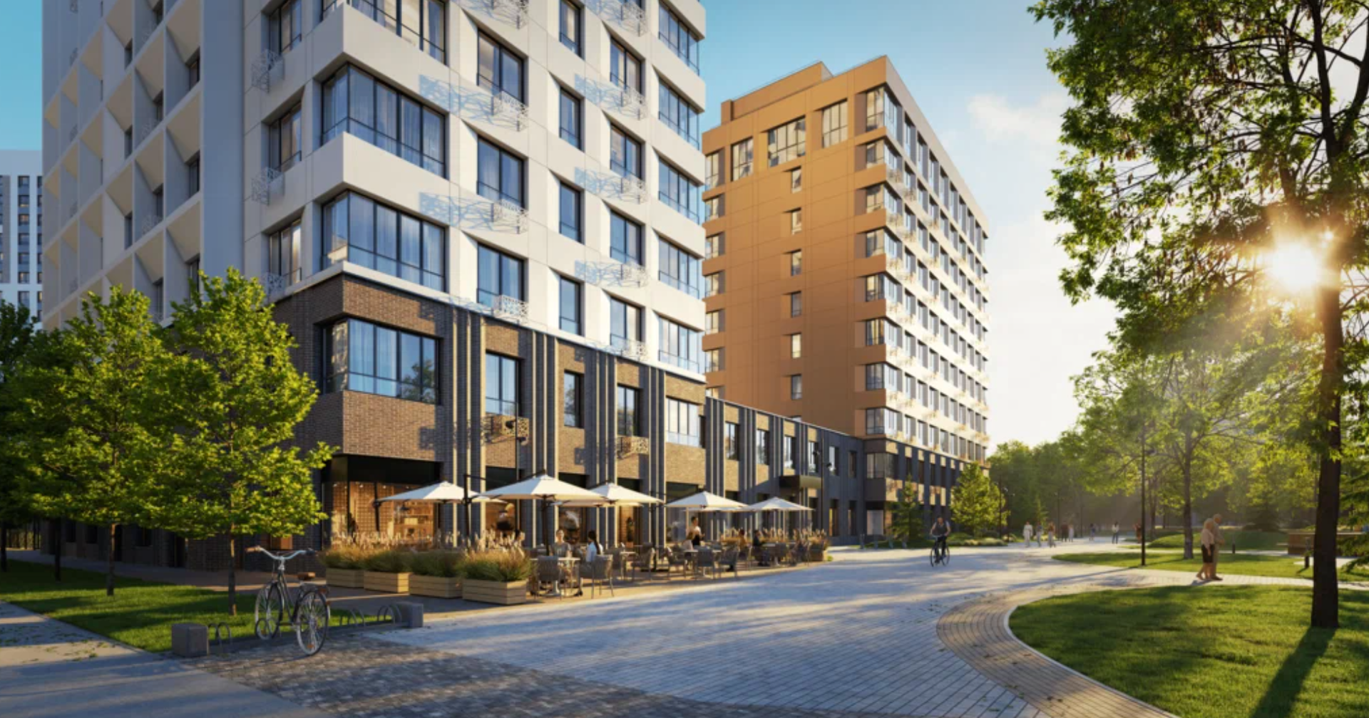 Ещё одна особенность ЖК — разделение всего пространства на два типа: общественное и приватное. В первом будут располагаться кафе, ресторан с террасой, входные группы и заезды в подземный паркинг, во втором — лаундж-зоны, фонтан, игровые площадки и спортобъекты.
