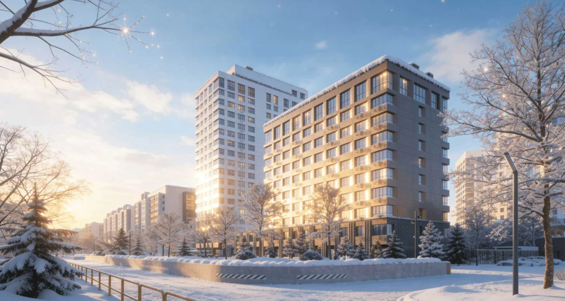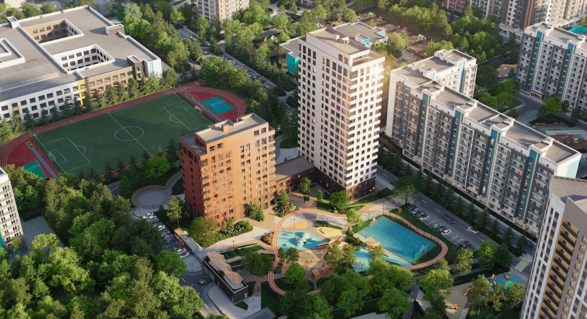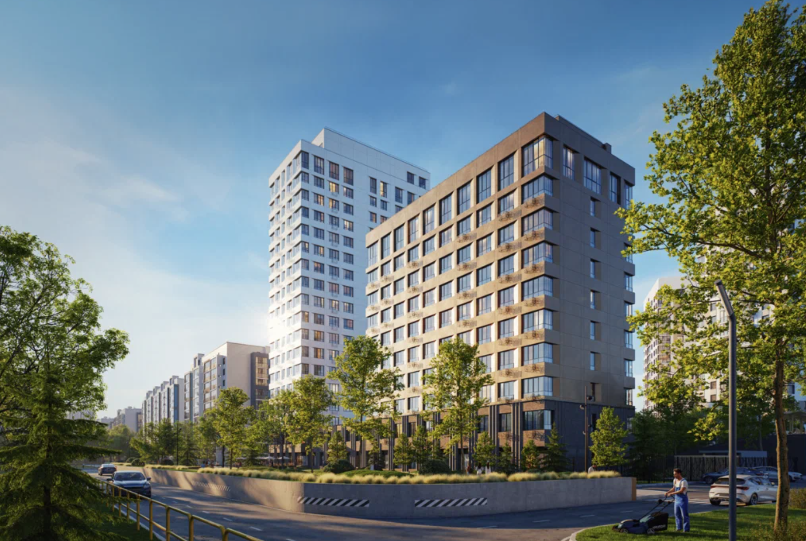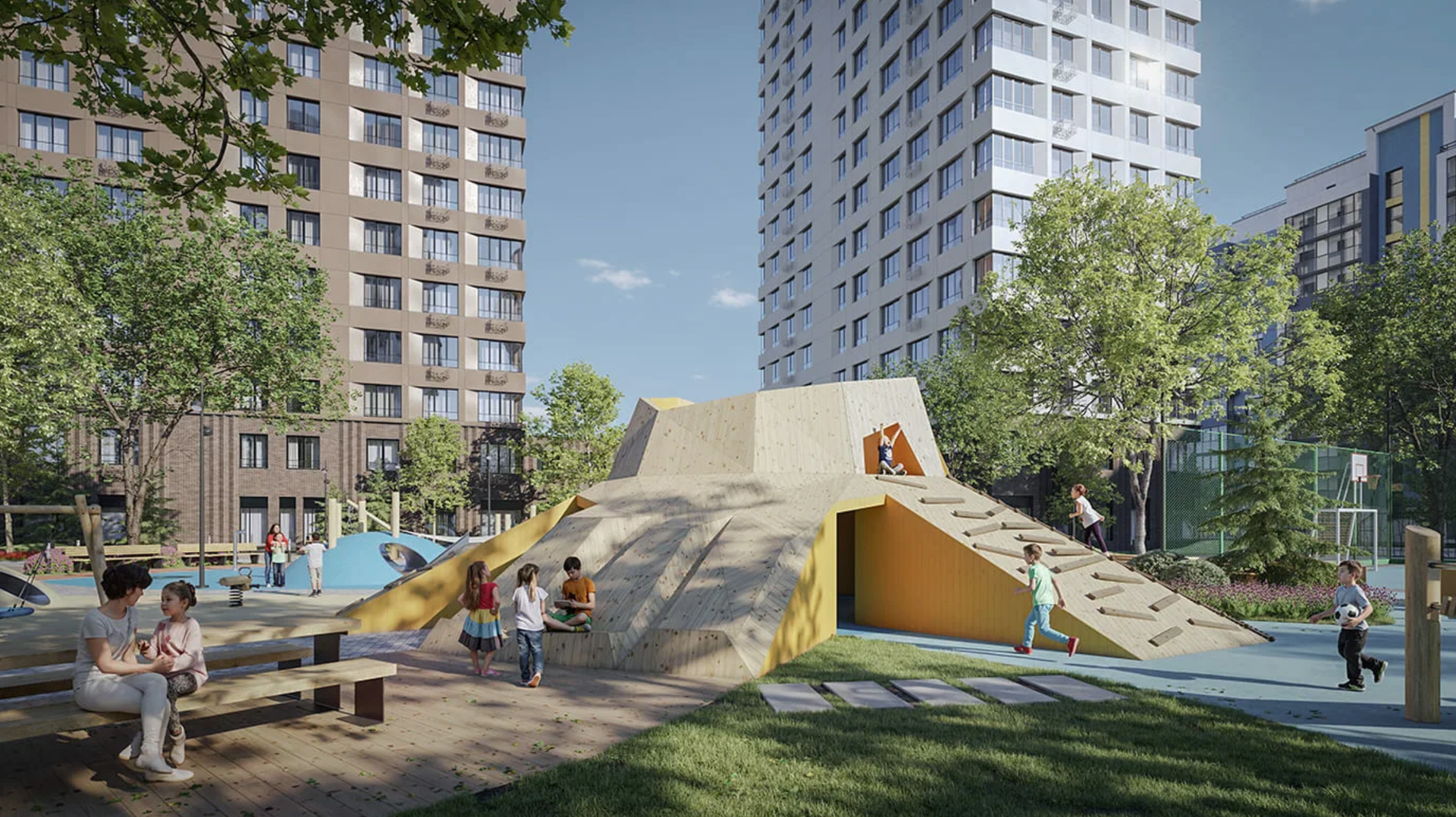 Ещё одна особенность ЖК — разделение всего пространства на два типа: общественное и приватное. В первом будут располагаться кафе, ресторан с террасой, входные группы и заезды в подземный паркинг, во втором — лаундж-зоны, фонтан, игровые площадки и спортобъекты.