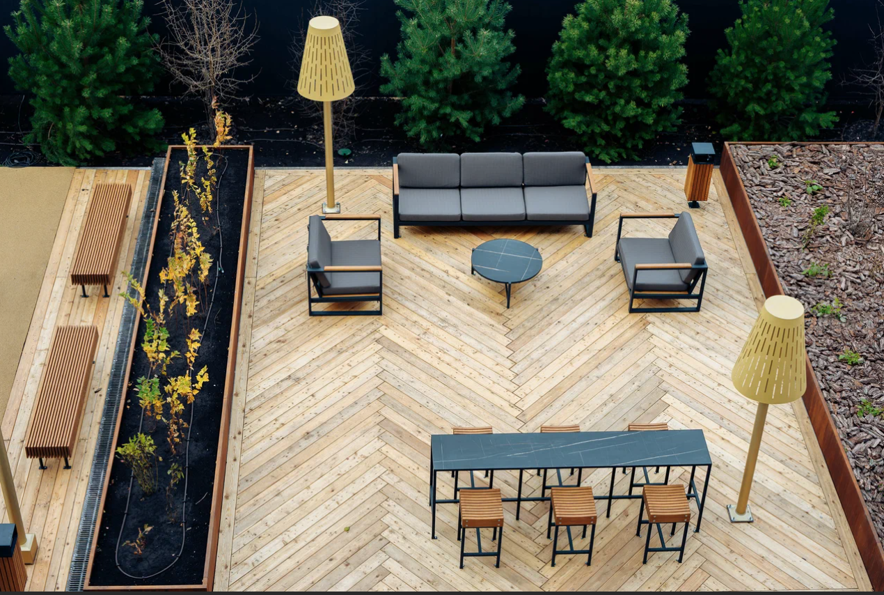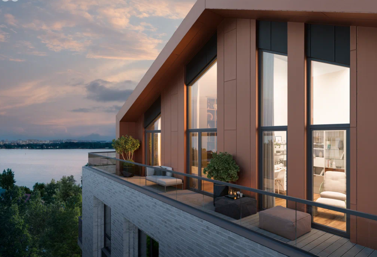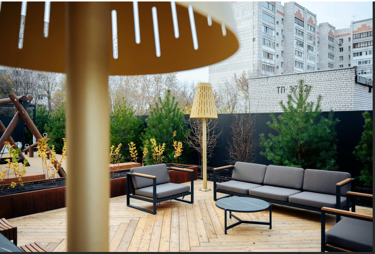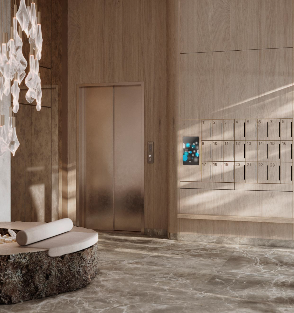 Привычные предметы интерьера лобби выглядят как арт-объекты. Ассоциации с салоном океанского лайнера: плавные стены и акцентная люстра на потолке с мерцающими каплями воды отсылают к речной тематике, а медные оттенки металла и деревянные текстуры — к ремеслу судостроителей