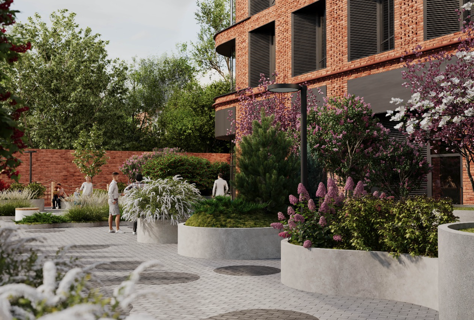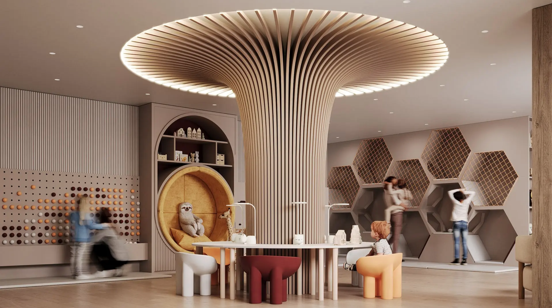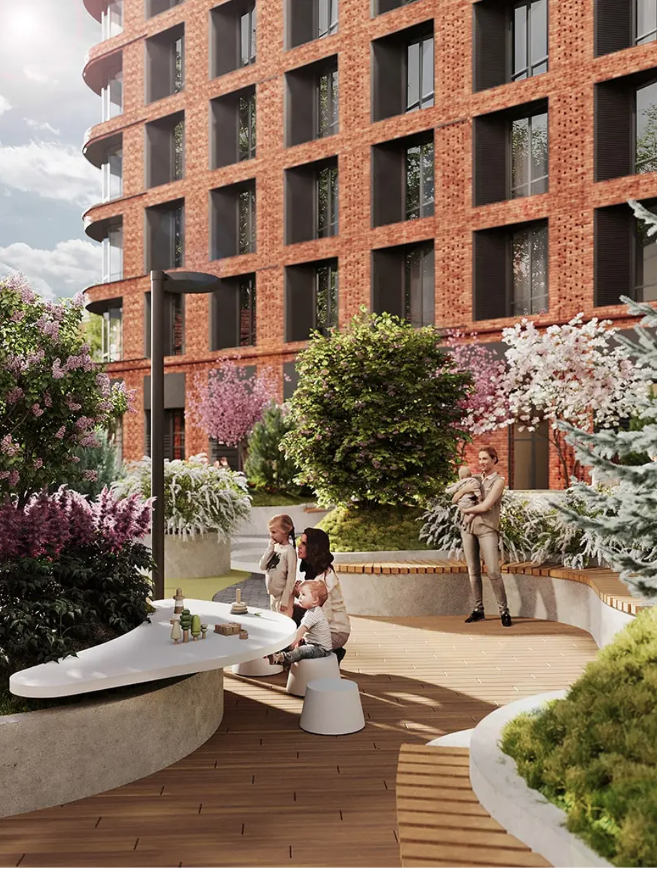 Внутри комплекса есть множество удобств, включая собственный кинотеатр, зимний сад, детские и спортивные зоны, а также коворкинг и комнаты для занятий с репетиторами.