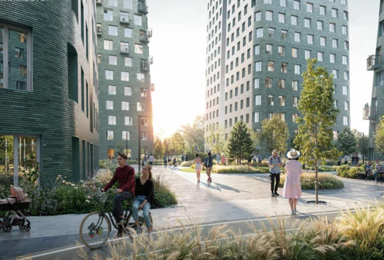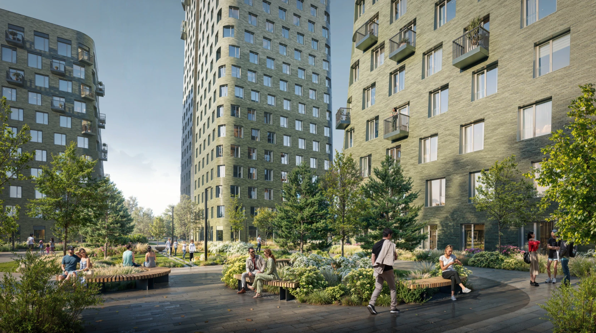 Проект включает дома разной высоты. Это позволяет солнечному свету проникать во двор, делая его светлым и уютным. В результате создаётся пространство, где хочется проводить время — гулять, отдыхать и наслаждаться жизнью.