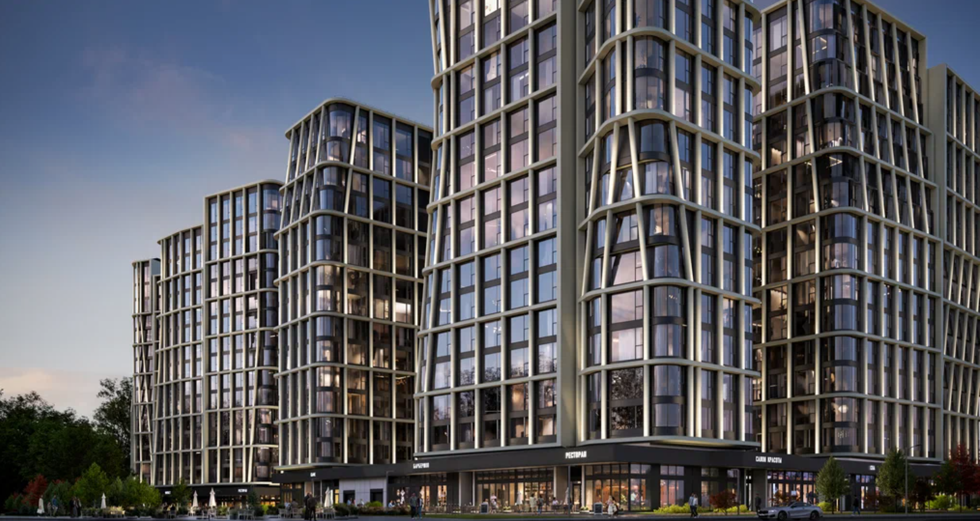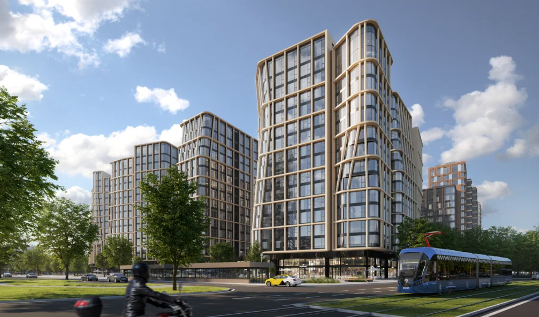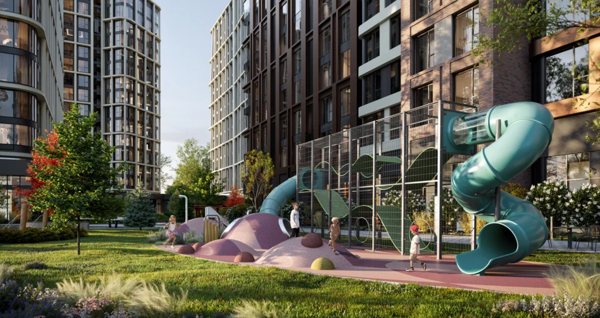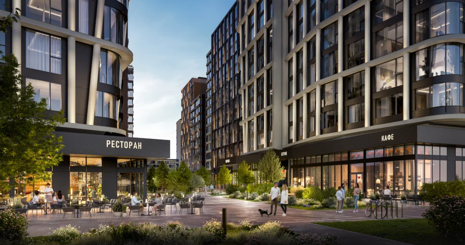 На первом этаже появятся ресепшен, зона ожидания для посетителей с мягкой мебелью, лапомойка, колясочная и места для хранения велосипедов. Лифты можно будет вызвать бесконтактно — через приложение в мобильном телефоне. На территории предусмотрены подземный паркинг на 347 мест, а также кладовые. В комплексе построят детский сад на 200 мест и школу с IT-уклоном на 430 учащихся. На первых этажах домов откроют ресторан, кафе, минимаркет, фермерскую лавку, аптеку, медицинскую клинику, химчистку. Во дворах появятся детские и спортивные площадки, стол для пинг-понга, лавочки, сад с амфитеатром, площадка для выгула собак. Дома соединят между собой пешеходными дорожками.